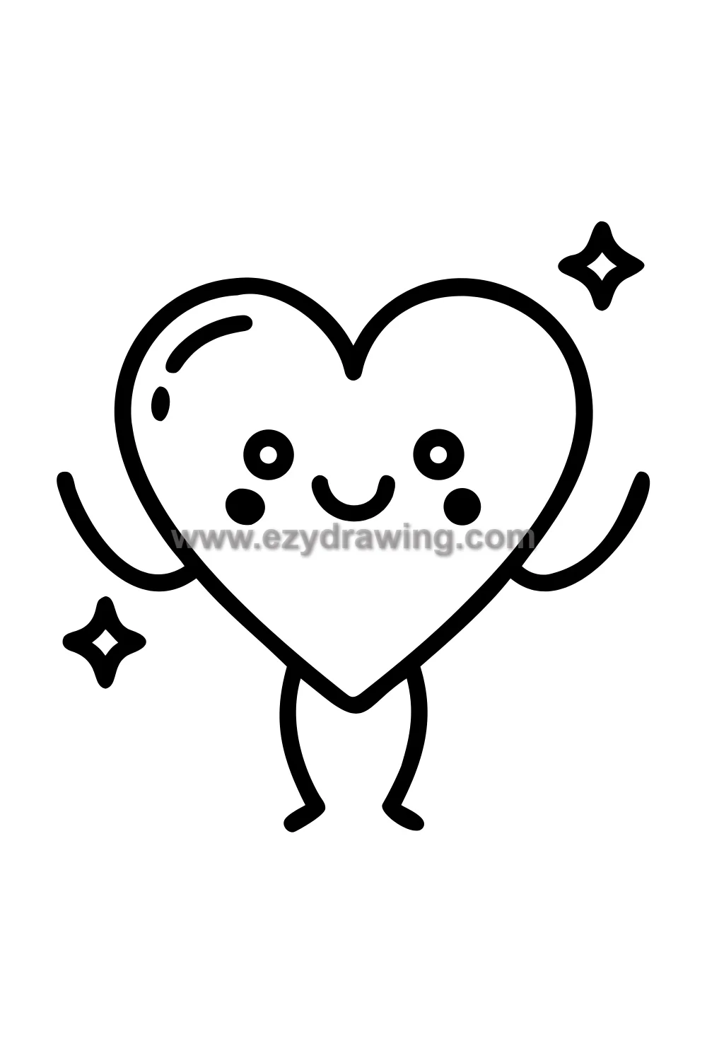 The kawaii heart is built on the simplest possible foundation — the familiar double-bump heart silhouette — and transformed into a living character through just four additions: a smiling face, blush marks, arms, and legs. These minimal additions are all that separates a simple shape from an irresistible character, which is the fundamental lesson of kawaii character design.