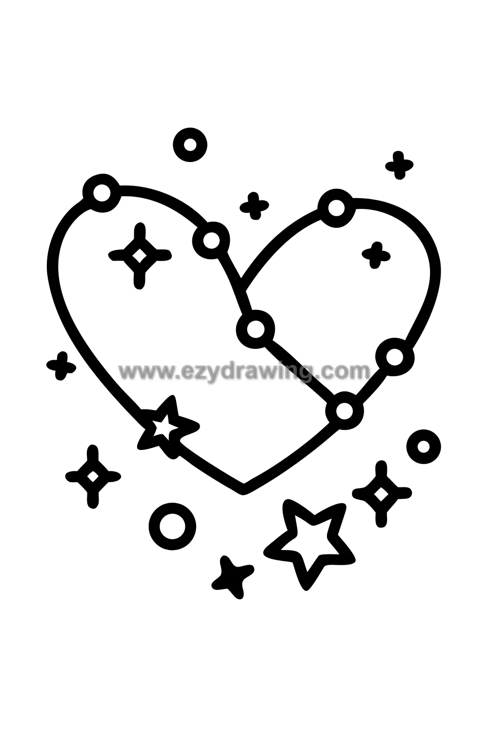 The heart constellation is drawn by placing star dots at key points of the heart outline — the two top bumps, the side curves, and the lower point — then connecting them with straight lines as constellation maps always do. The remaining space around the constellation receives additional smaller star dots that are not connected, creating the random star field background that makes the connected constellation stand out.