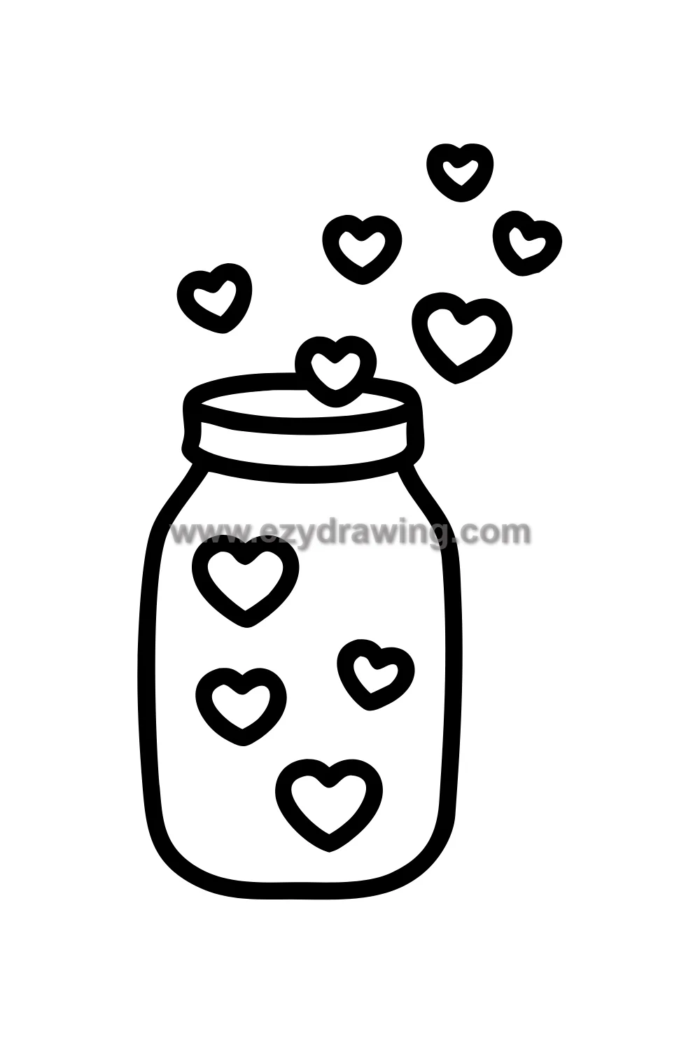 The jar interior filled with hearts is drawn by first establishing the glass jar shape, then filling the interior space with small heart shapes of varying sizes — some larger and clearly defined, others smaller and partially hidden behind neighboring hearts, all in different colors creating a joyful rainbow of affection. The hearts floating above the jar rim continue the same drawing approach but placed freely in the open air above.
