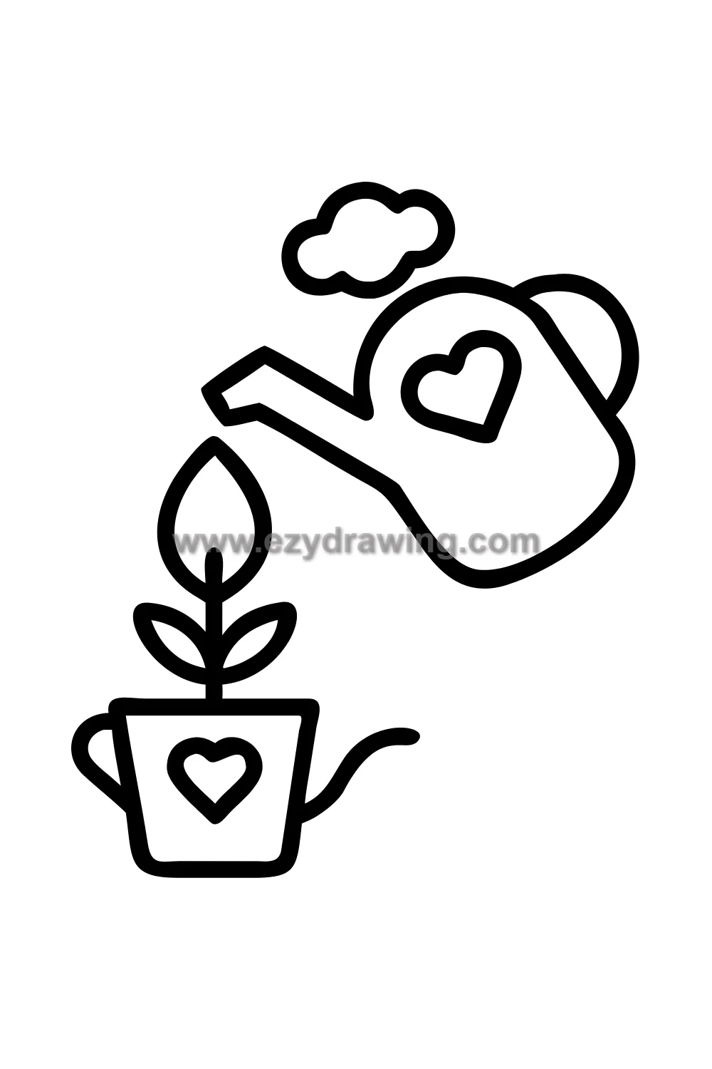 A small potted plant grows upward with leaves unfurling at intervals along its stem, and at the very top where a flower would bloom, a perfect heart has opened instead — the most tender visual metaphor for love as something that must be planted intentionally, watered consistently, and tended with care before it will bloom into its full beautiful form. The small watering can beside it completes the nurturing narrative.