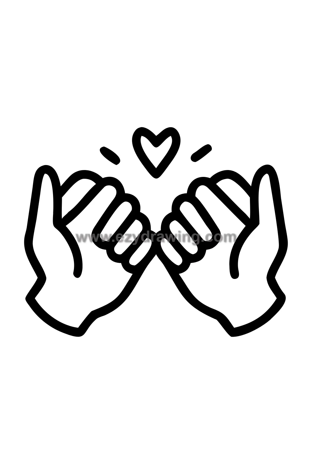 The pinky promise hand position is drawn with both hands oriented toward each other, the pinky fingers extended forward and hooked together at the first joint, and the other fingers naturally curled. The two hands are at slightly different angles as they would be in a real pinky promise, creating a natural and un-posed quality to the gesture that makes it feel genuine.