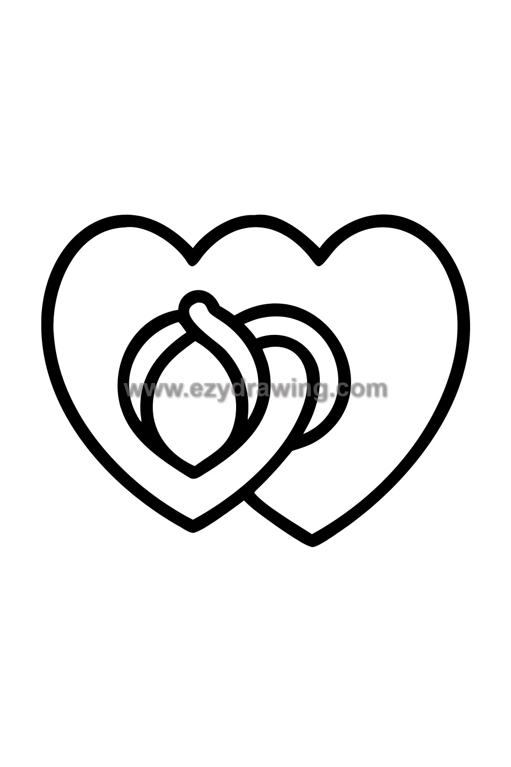 The intertwined heart design is achieved by drawing two heart shapes that overlap with one passing in front of and behind the other — the classic chain link logic applied to heart shapes. Where heart A passes in front of heart B, heart A’s outline is drawn over heart B’s, and vice versa in the alternating section. This simple overlapping creates the convincing linked chain effect.