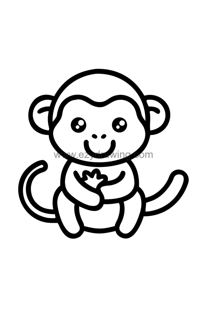This drawing has a happy, satisfied mood perfect for food themes and showing monkeys with their iconic snack. The eating pose and held banana provide excellent practice for drawing characters interacting with objects and expressing enjoyment, while also helping you build skills that can be applied to bear drawing and other cute animal illustrations.