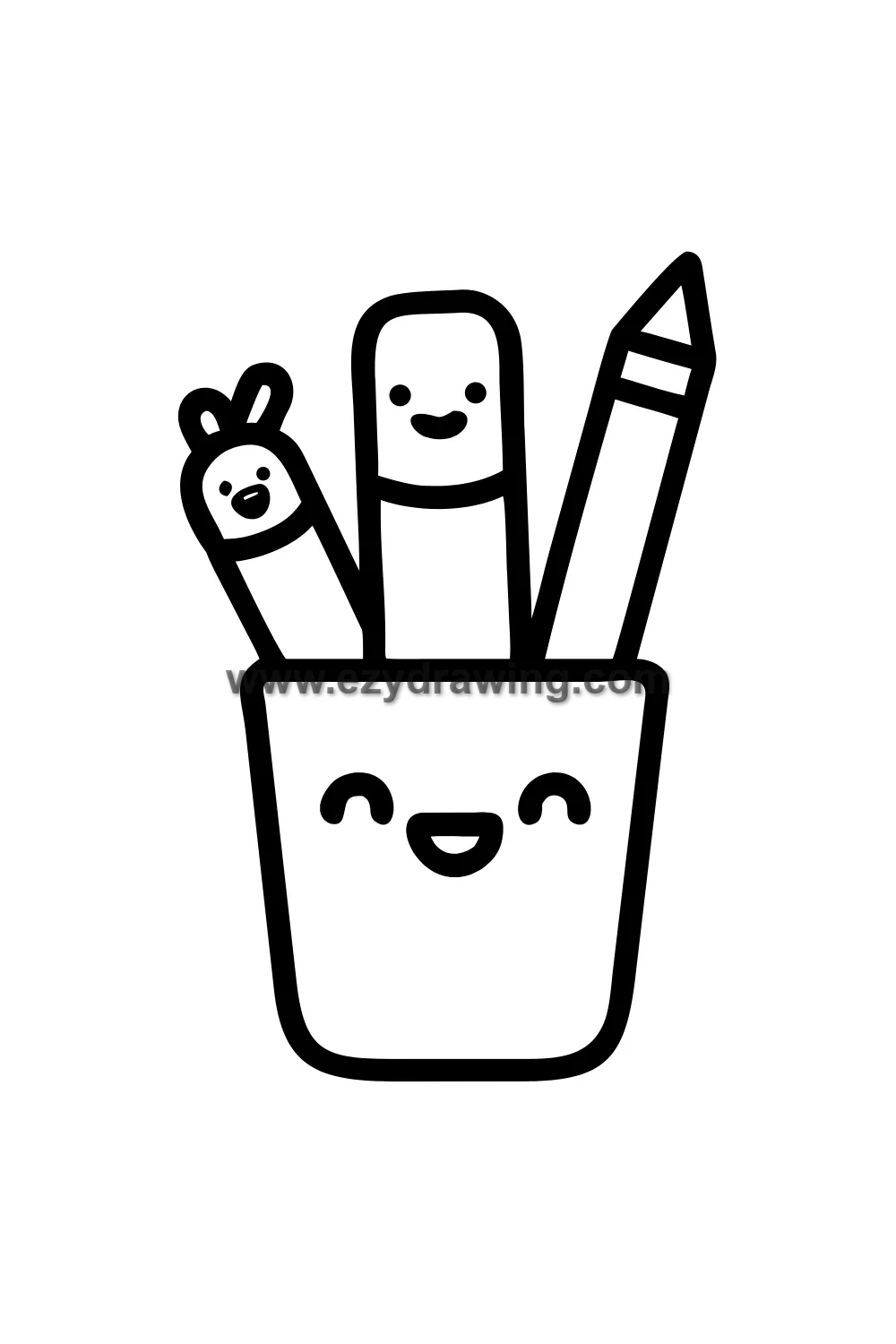 The pencil case body is a simple rounded rectangle with a zipper line along the top and teeth detail — very manageable for beginners. The art supplies peeking out from inside are drawn at different heights, each one recognizable by its basic shape: pencils with pointed tips, round pens, rectangular erasers, all wearing tiny kawaii faces.