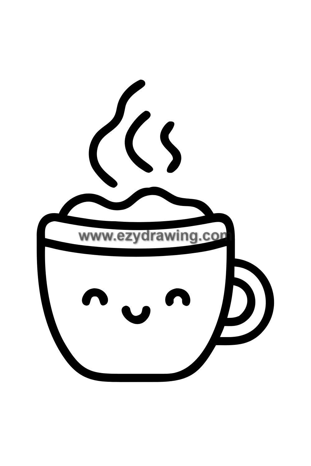 Simple cute kawaii coffee mug drawing with a smiley face on the front, steam curling upward in decorative swirls, cozy handle, warm golden brown coffee visible at the top, rosy cheeks. Kawaii chibi style with simplified rounded mug shape, decorative handle, kawaii face in center, layered steam wisps above, warm coloring suggesting morning comfort. White background with clean black line art and warm cream mug body with brown coffee and soft steam coloring. Easy drawing style suitable for kids. Small text 'ezydrawing.com' in bottom corner of image.