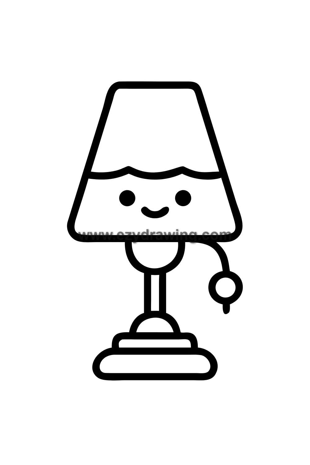 Simple cute table lamp drawing with a warm glowing shade, kawaii face on the base, one small arm reaching out to switch itself on, warm golden light spilling outward, cozy bedroom atmosphere. Kawaii cozy night style with simplified lamp base and shade shape, soft glow radiating from shade opening, gentle friendly face on base, warm atmospheric golden light coloring. White background with clean black line art and warm golden glow, cream shade, and soft lamp base coloring. Easy drawing style suitable for kids. Small text 'ezydrawing.com' in bottom corner of image.