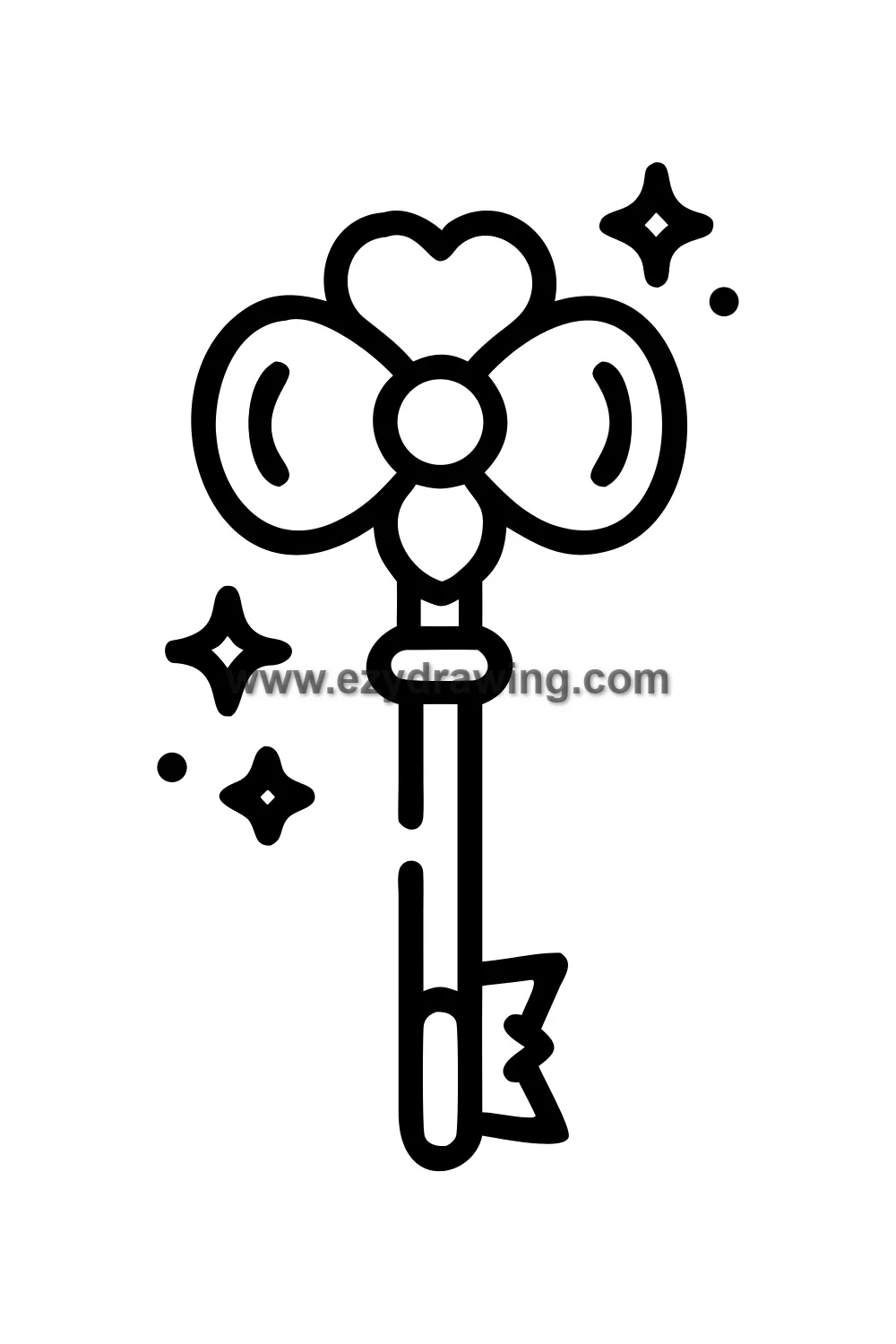 Simple cute ornate key drawing with decorative bow end, pointing toward a tiny glowing magical door that has appeared in an otherwise blank space, sense of mystery and possibility, sparkles around keyhole. Kawaii magical mystery style with simplified vintage key shape with decorative oval bow end and simple bit teeth, small glowing doorway shape nearby with sparkle effects suggesting something wonderful behind it. White background with clean black line art and warm gold key with soft glowing door and sparkle coloring. Easy drawing style suitable for kids. Small text 'ezydrawing.com' in bottom corner of image.