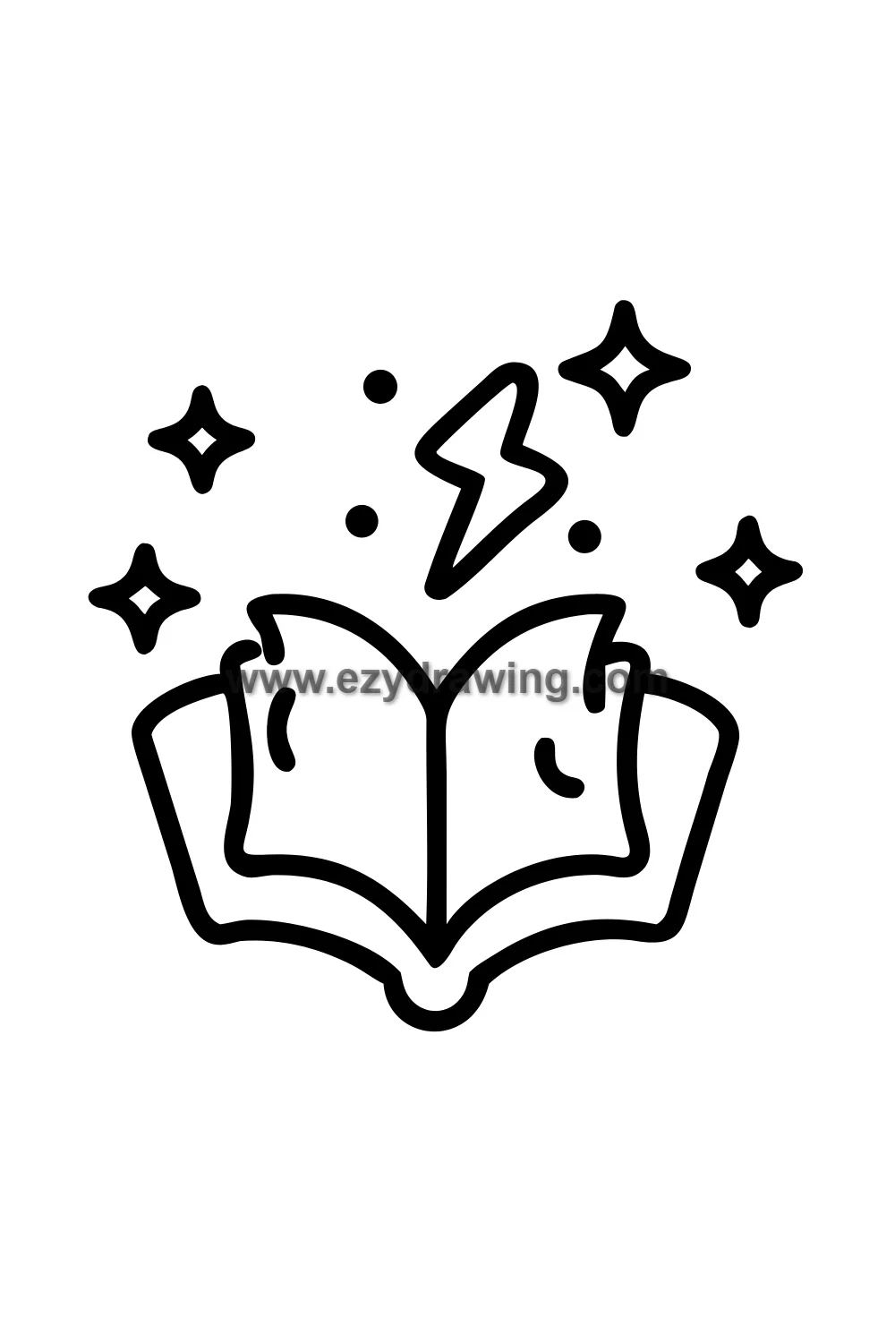 Simple cute open book drawing with magical elements emerging from the pages — tiny characters, stars, castles, and swirls rising upward as if the story is physically coming to life from the text. Kawaii magic story style with simplified open book shape, various small magical elements floating upward from pages, sparkle effects, sense of wonder and imagination spilling outward. White background with clean black line art and cream book pages with colorful magical emerging elements coloring. Easy drawing style suitable for kids. Small text 'ezydrawing.com' in bottom corner of image.