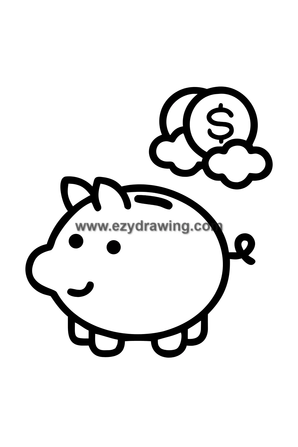Simple cute pink piggy bank drawing with a coin slot on top, kawaii face, little legs, dreaming of piles of gold coins shown in a thought bubble above, expression hopeful and determined. Kawaii savings character style with classic rounded pig body shape, coin slot on back, small curly tail, tiny legs, kawaii face, thought bubble above showing simplified coin stack dream. White background with clean black line art and classic pink piggy bank with golden coin thought bubble coloring. Easy drawing style suitable for kids. Small text 'ezydrawing.com' in bottom corner of image.