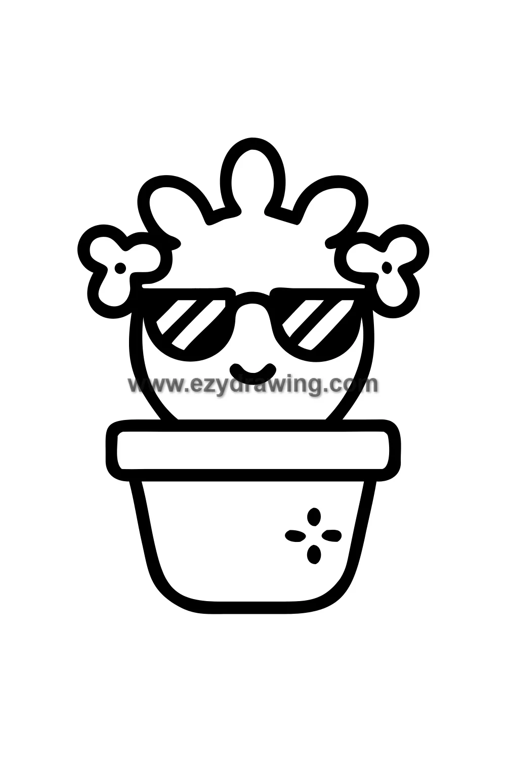 Simple cute cactus drawing in a terracotta pot, wearing tiny cool sunglasses, expression effortlessly unbothered and cool, small flowers blooming on top, desert cool personality. Kawaii cool character style with simplified round or columnar cactus body with arm bumps, classic terracotta pot, tiny oval sunglasses on face, small pink blooms at top, ultimate cool relaxed expression. White background with clean black line art and green cactus, warm terracotta pot, and pink flower coloring. Easy drawing style suitable for kids. Small text 'ezydrawing.com' in bottom corner of image.