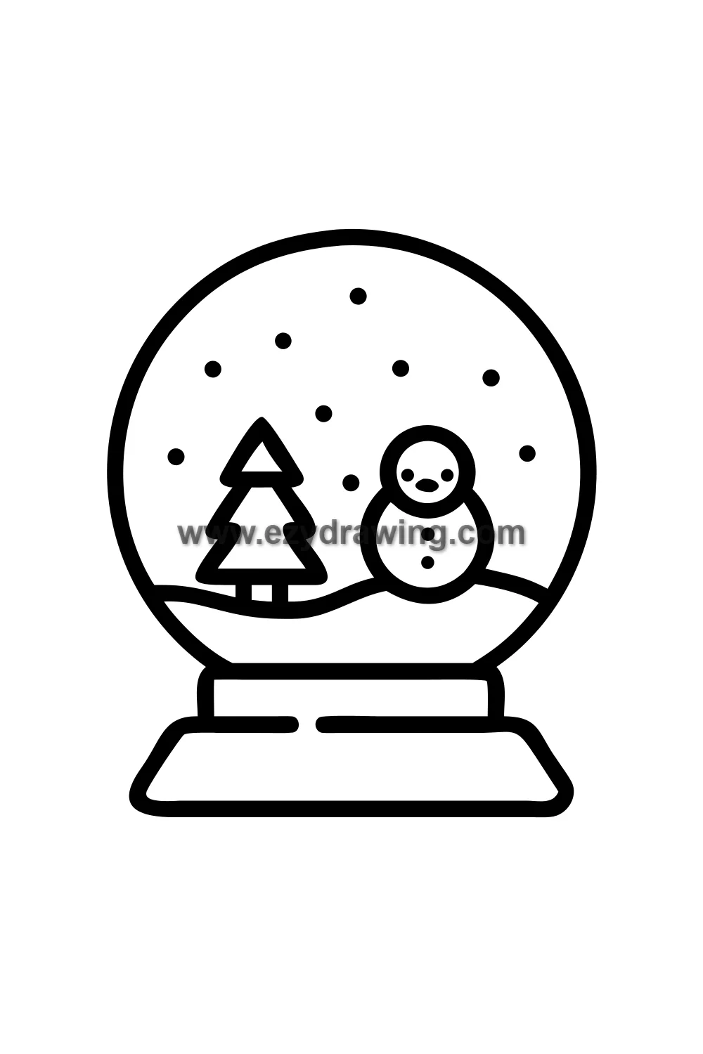 Simple cute snow globe drawing with a tiny winter scene inside the glass sphere — miniature snowman, small trees, falling snow — on a decorative wooden base, magical and enchanting. Kawaii winter magic style with simplified large glass sphere shape, miniature scene visible inside with tiny snowman and trees, snow dots falling within globe, decorative base beneath, sense of contained magic. White background with clean black line art and soft blue-white globe interior with warm wooden base coloring. Easy drawing style suitable for kids. Small text 'ezydrawing.com' in bottom corner of image.
