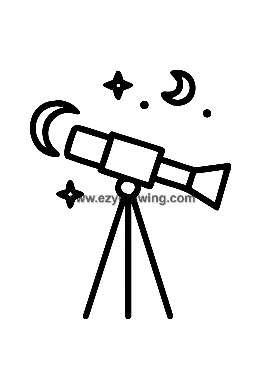 Simple cute telescope drawing on a tripod stand pointed upward at the night sky, stars and a crescent moon visible through the lens in a thought bubble, expression of wonder and discovery. Kawaii stargazer style with simplified telescope tube on three-leg tripod stand, eyepiece detail, stars and moon visible as if seen through the lens shown in small circle above, nighttime wonder atmosphere. White background with clean black line art and deep blue night sky accent with warm brass telescope coloring. Easy drawing style suitable for kids. Small text 'ezydrawing.com' in bottom corner of image.