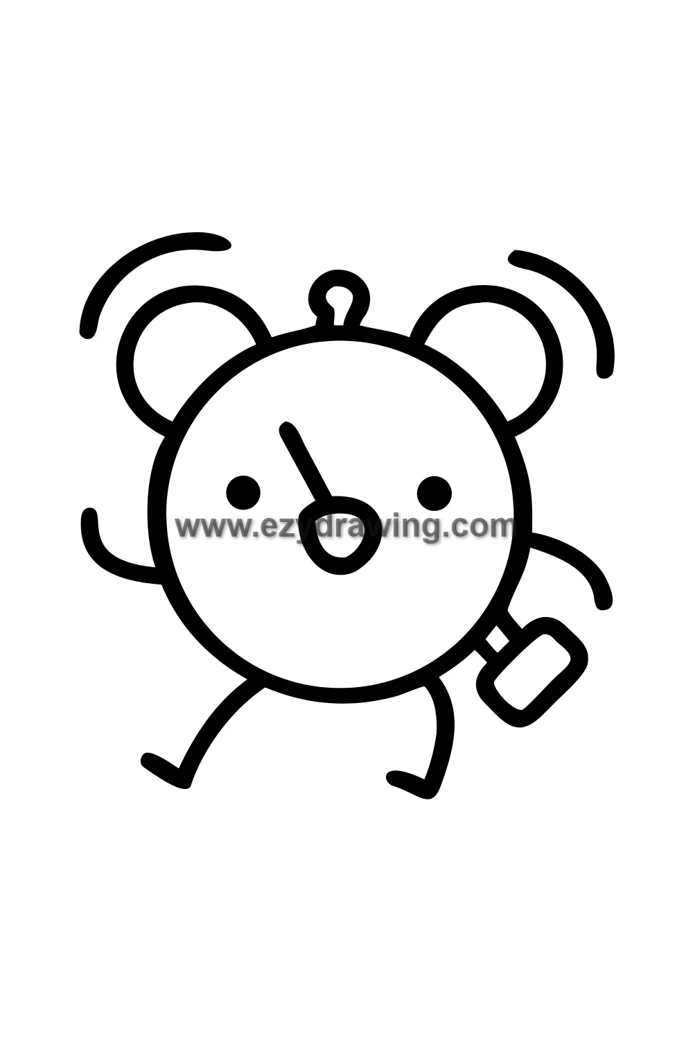 The classic round alarm clock body becomes the character’s head and torso simultaneously — the clock face with its numbers and hands is drawn on the front, the twin bells sit on top like ears or horns, and simple stick arms and legs extend from the sides and bottom in a dynamic running pose.