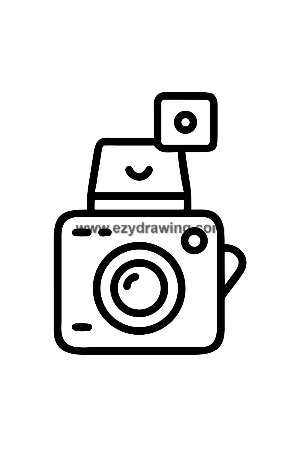 Simple cute vintage camera drawing with a happy face on the lens, small strap, ready to capture the world, expression eager and curious, small viewfinder detail on top. Kawaii photography style with simplified boxy vintage camera body, circular lens as main face feature with kawaii eyes inside, top viewfinder bump, side strap attachment, film advance knob details. White background with clean black line art and warm black and silver vintage camera with pop of color accent coloring. Easy drawing style suitable for kids. Small text 'ezydrawing.com' in bottom corner of image.