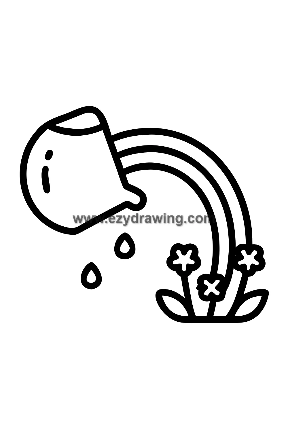Simple cute watering can drawing with water pouring from the spout and a tiny rainbow forming in the water droplets, small flowers growing where the water lands, nurturing and magical. Kawaii garden magic style with simplified classic watering can shape, curved spout with droplet stream, tiny rainbow arc in the mist of droplets, small blooms appearing on ground below where water falls. White background with clean black line art and soft green watering can with rainbow droplets and colorful small flower coloring. Easy drawing style suitable for kids. Small text 'ezydrawing.com' in bottom corner of image.
