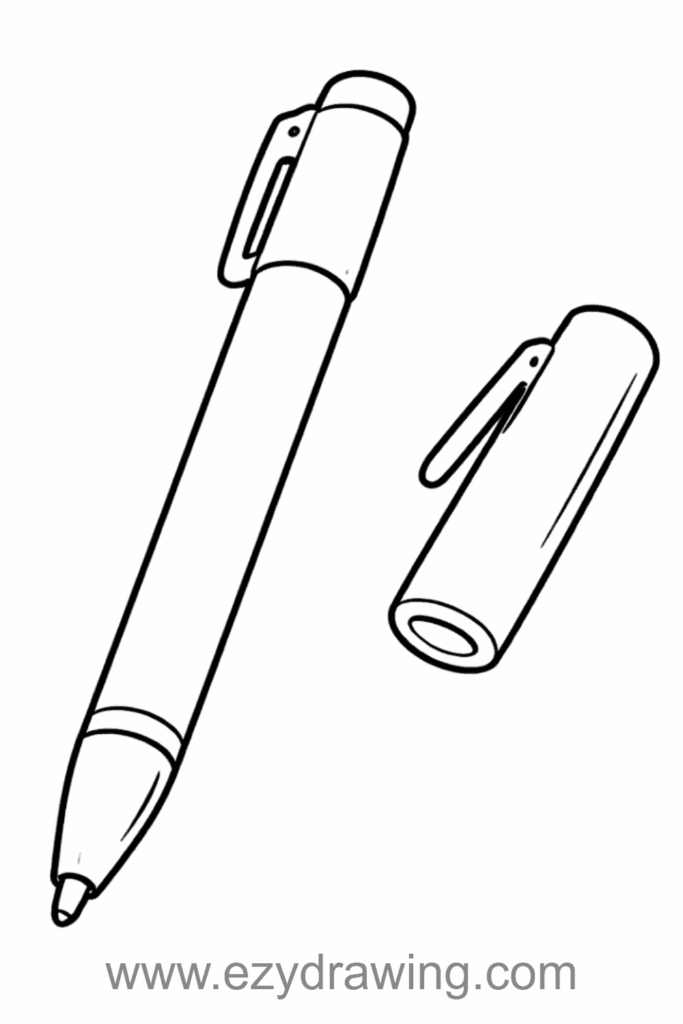 The pen’s cylindrical shape tapers slightly toward the writing tip, with a simple clip attached to the cap for securing it to a pocket or notebook. The cap can be drawn either on top of the pen or floating beside it to show both pieces clearly. A small band near the tip adds a touch of detail without making it too complicated.