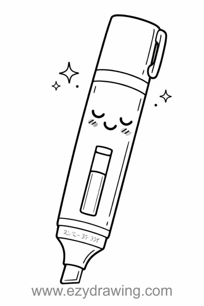 The highlighter’s body is slightly transparent, showing the vibrant colored ink inside that creates those perfect highlighted lines. Its flat, angled chisel tip is drawn wider than a normal pen point, perfect for covering text without hiding it completely. The pen has a sweet kawaii face with closed, content eyes and rosy cheeks, looking proud of its special highlighting abilities.