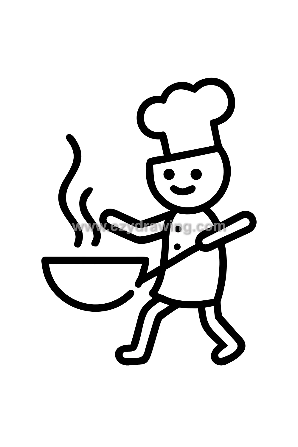 The chef uniform is one of the most characterful and recognizable professional costumes in people drawing — the double-breasted white jacket, the tall toque hat, and the kitchen context all immediately communicate profession and passion simultaneously. The cooking action — stirring, flipping, tasting — gives the figure a dynamic and purposeful pose with clear physical engagement.