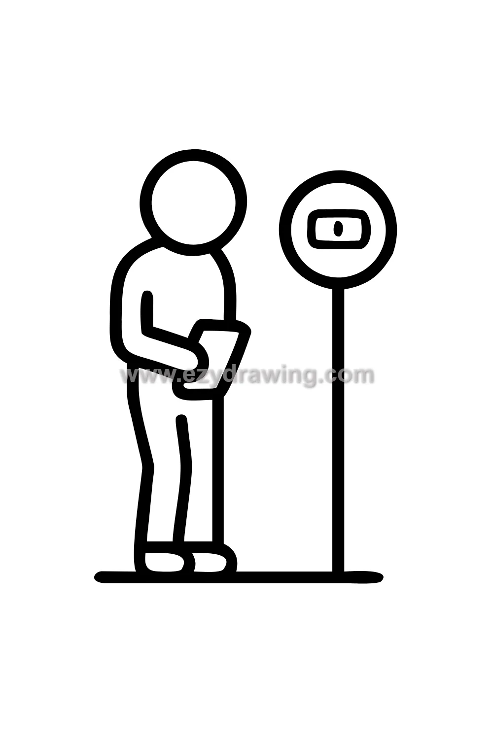 This everyday person waiting at the bus stop captures something genuinely profound in its apparent ordinariness — the universal human experience of waiting, the specific body language of someone checking how far away the bus is, the small personal details of their outfit that tell a quiet story about who they are and where they are going. This is people drawing at its most honest and observational.