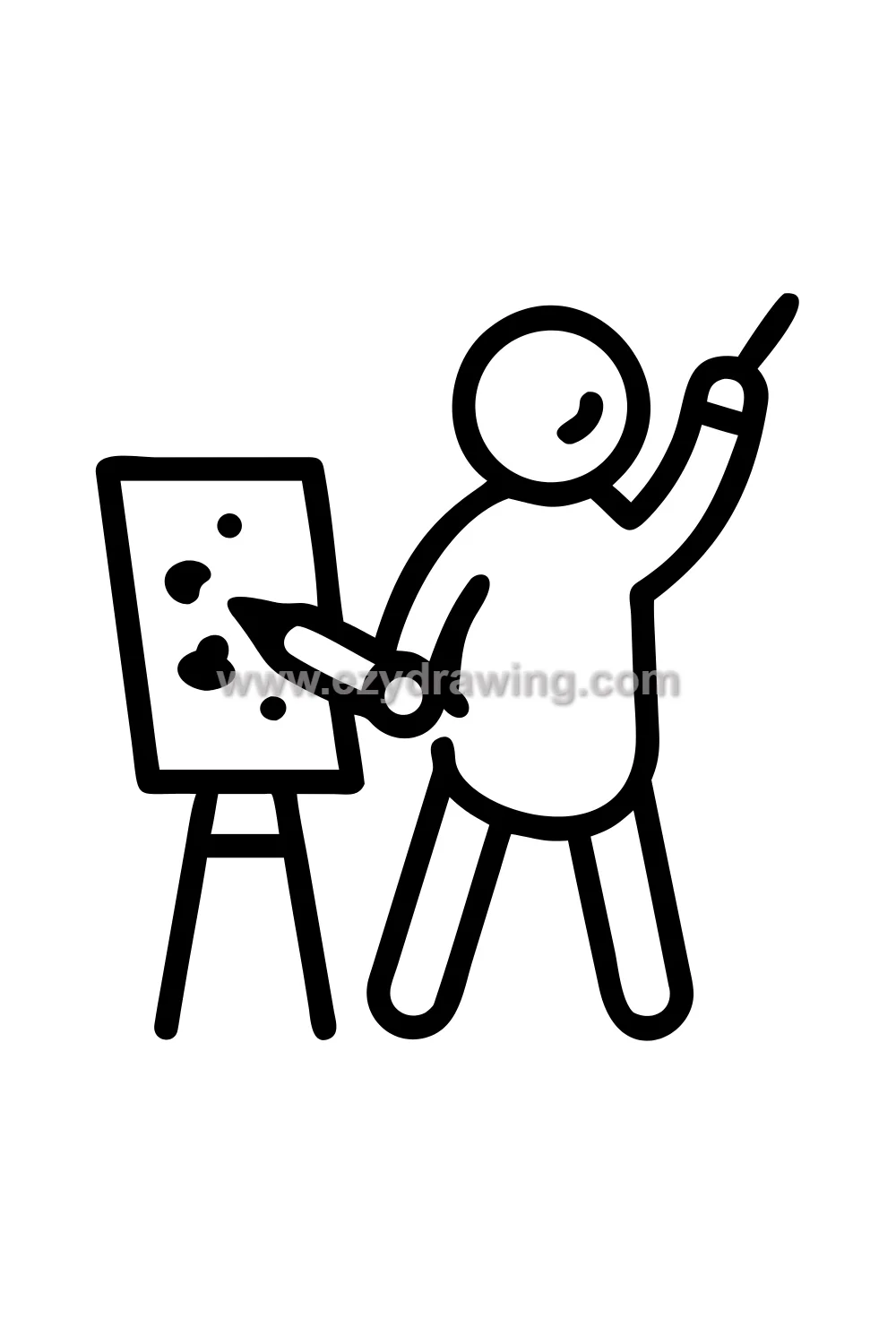 The paint-splattered clothes are one of the most character-defining details in this drawing — every splash and streak of color on the jacket and jeans is a mark of creative work, a record of paintings past, a badge of a life spent making. Drawing these marks in multiple colors across the clothing creates an instantly recognizable artist identity before the viewer even sees the canvas or brush.