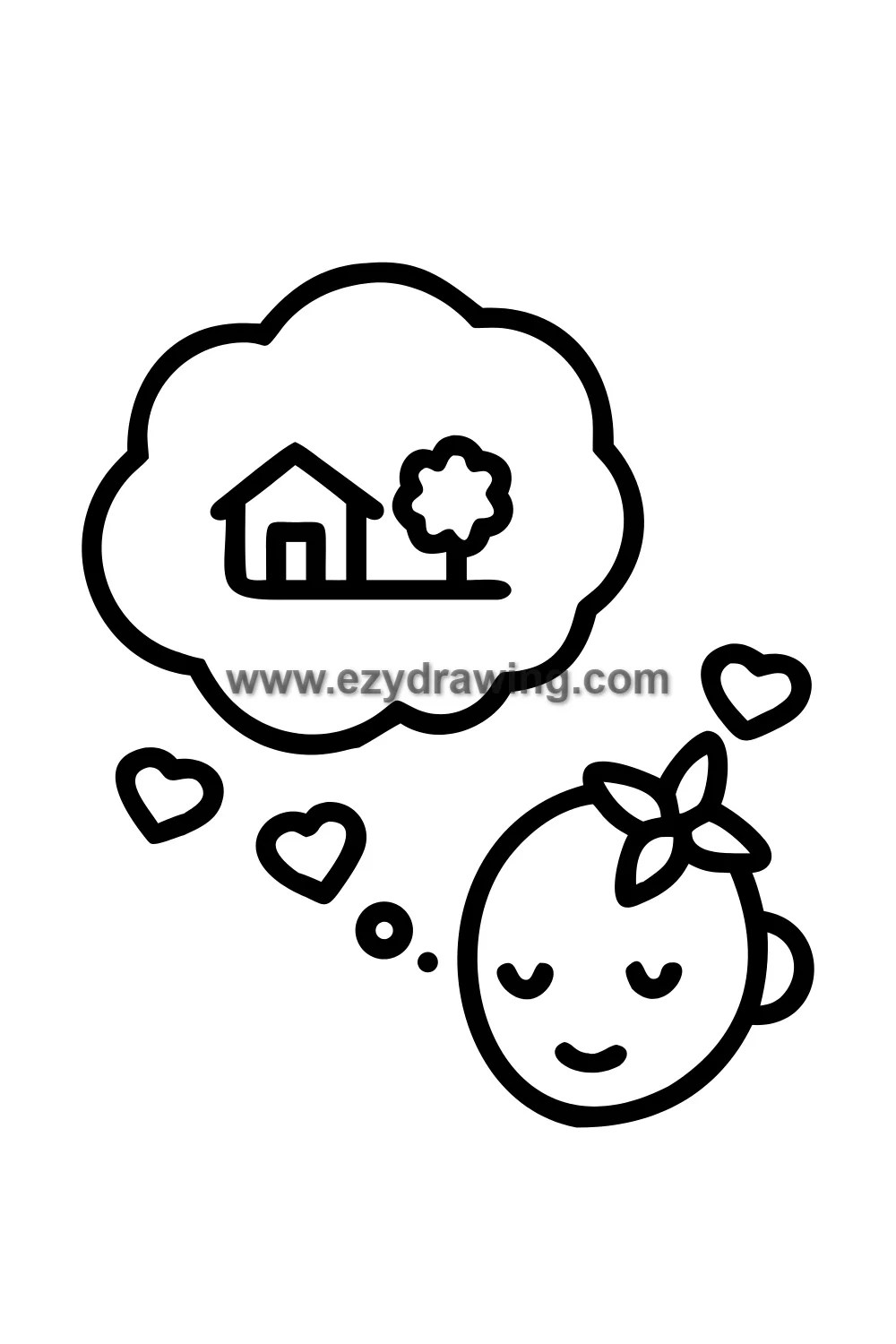 This dreamy profile wears the most distant, contemplative expression — and rising from their head in a classic thought bubble cloud is a window into their inner world — tiny stars, a small cozy house, a simple heart, small flower shapes, all the things this person quietly dreams about floating together in that soft oval above. We can see exactly what they are thinking.
