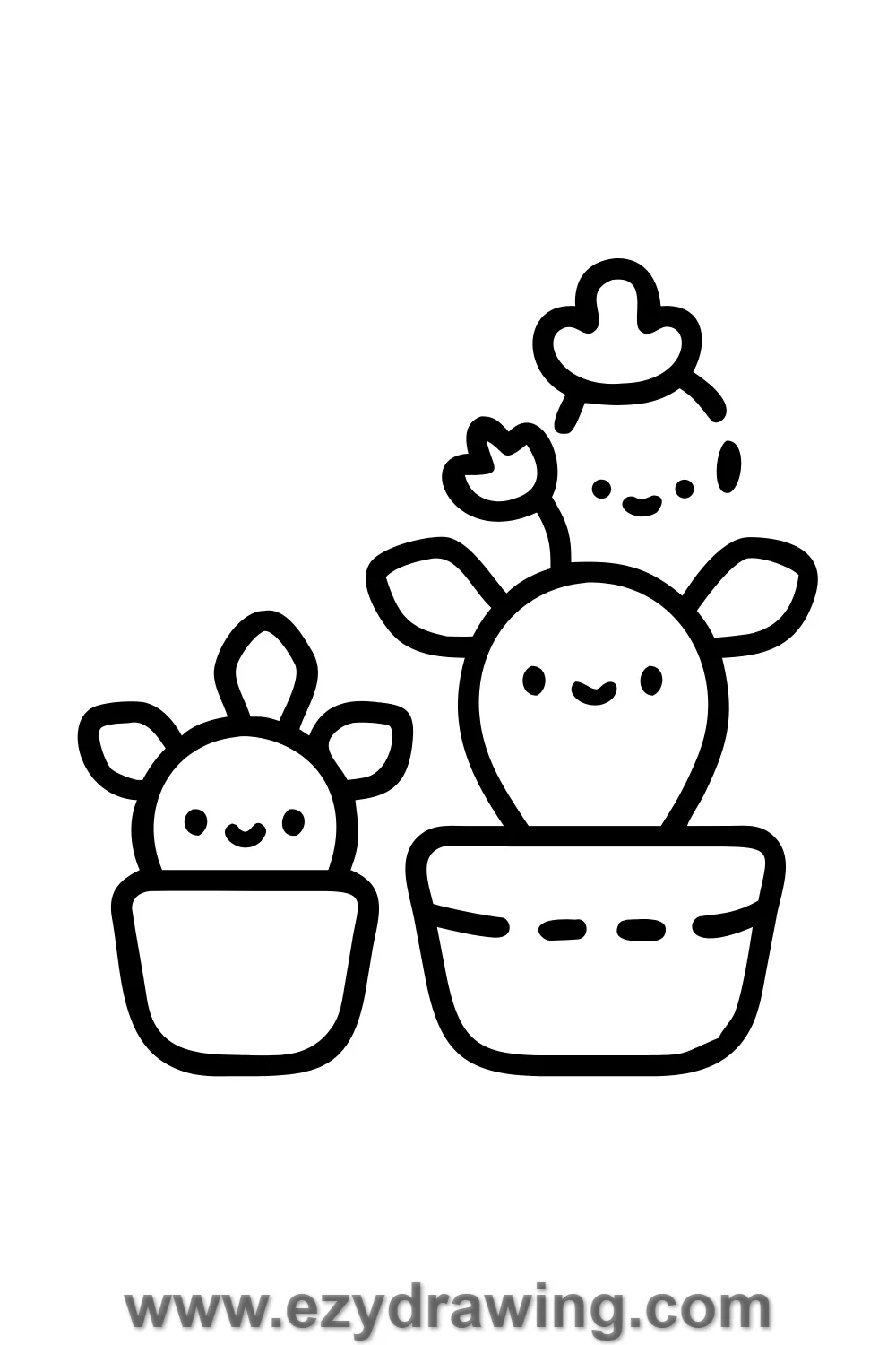 Draw a different cactus shape in each pot — round, tall, and branching.