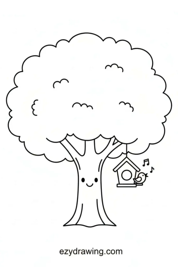 Draw an absolutely adorable tree with a happy face on its trunk! The smiling expression and fluffy cloud like leaves create a friendly, welcoming character that’s perfect for beginners. Add tiny blush spots or cute eyebrows to bring even more charm. You can also play with different leaf shapes to give your tree its own personality. This style makes the drawing fun, simple, and full of lively energy.