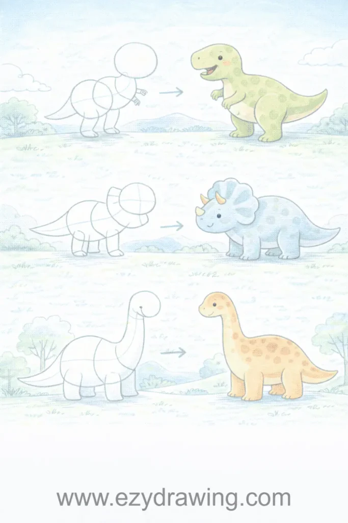 Pro Tip: Start with side-view dinosaurs since they’re easier than perspective angles, and focus on getting the distinctive silhouette right before adding scales and other surface details.
