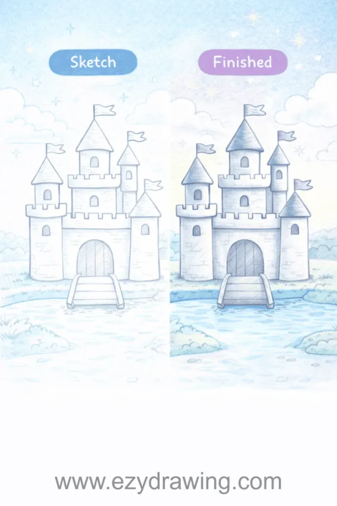 Pro Tip: Use a ruler for the main castle walls and towers to create clean lines, then let kids freestyle the decorative elements like flags, windows, and surrounding landscape for a perfect balance of structure and creativity.