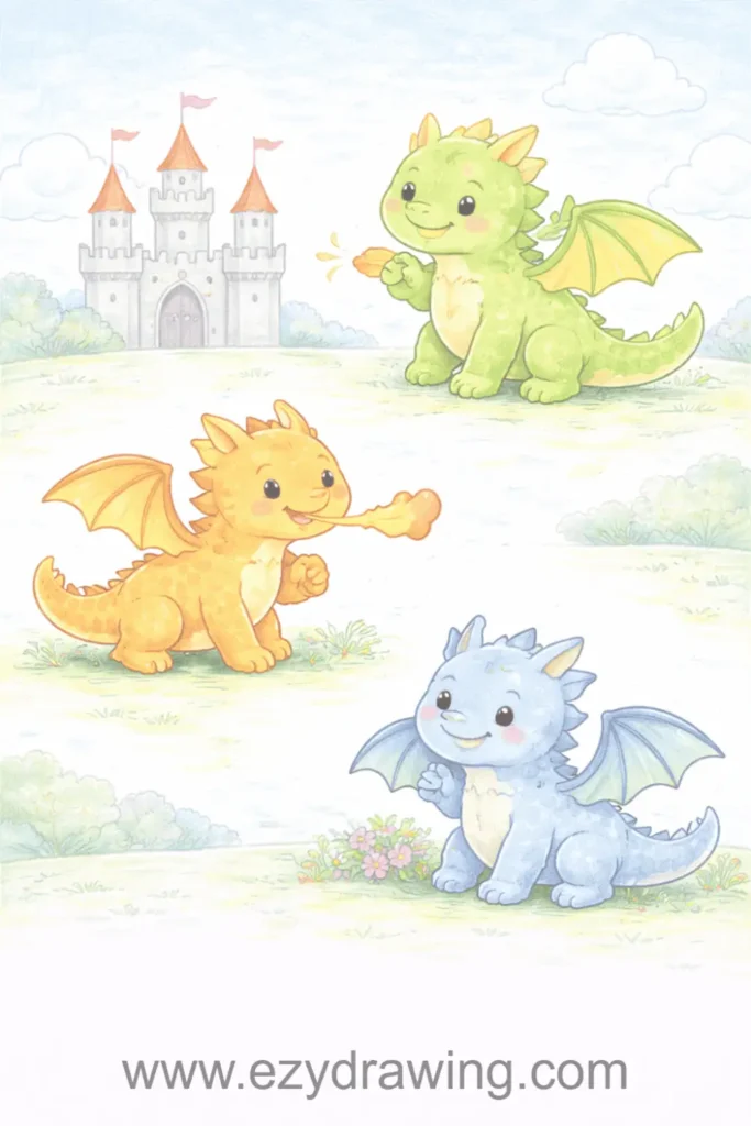 Dragon drawings combine elements from real animals with pure imagination, using reptile features, bird wings, and creative embellishments. Kids learn to reference reality while inventing fantastical creatures.