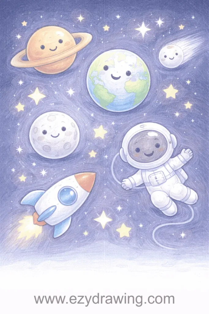Space drawings captivate kids while teaching them to work with circles for planets, stars, rockets, and astronauts against dark backgrounds. This theme naturally introduces contrast and negative space concepts.