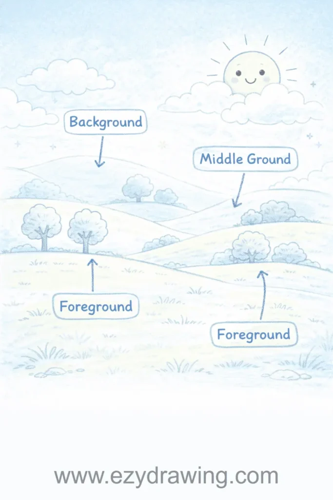 Teaching basic landscape composition helps kids understand foreground, middle ground, and background relationships through simple horizon lines. Rolling hills, trees, clouds, and a sun create peaceful scenes with minimal complexity.