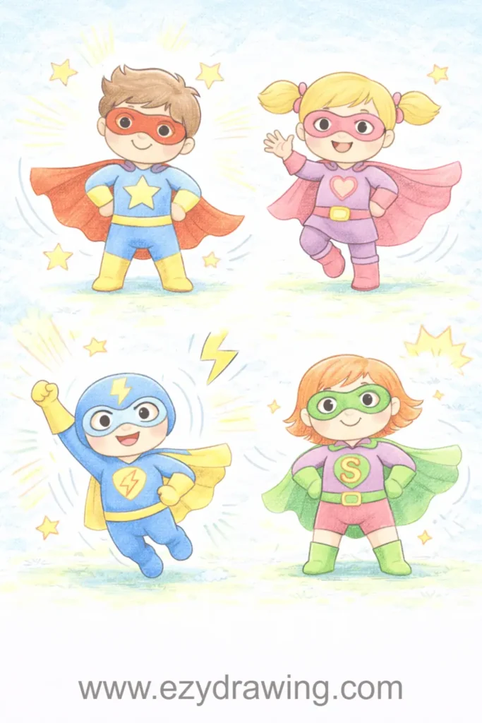 Superhero drawings let kids design original characters with unique powers, costumes, and symbols while learning human figure basics. Capes, masks, emblems, and action poses make these drawings exciting and personal.