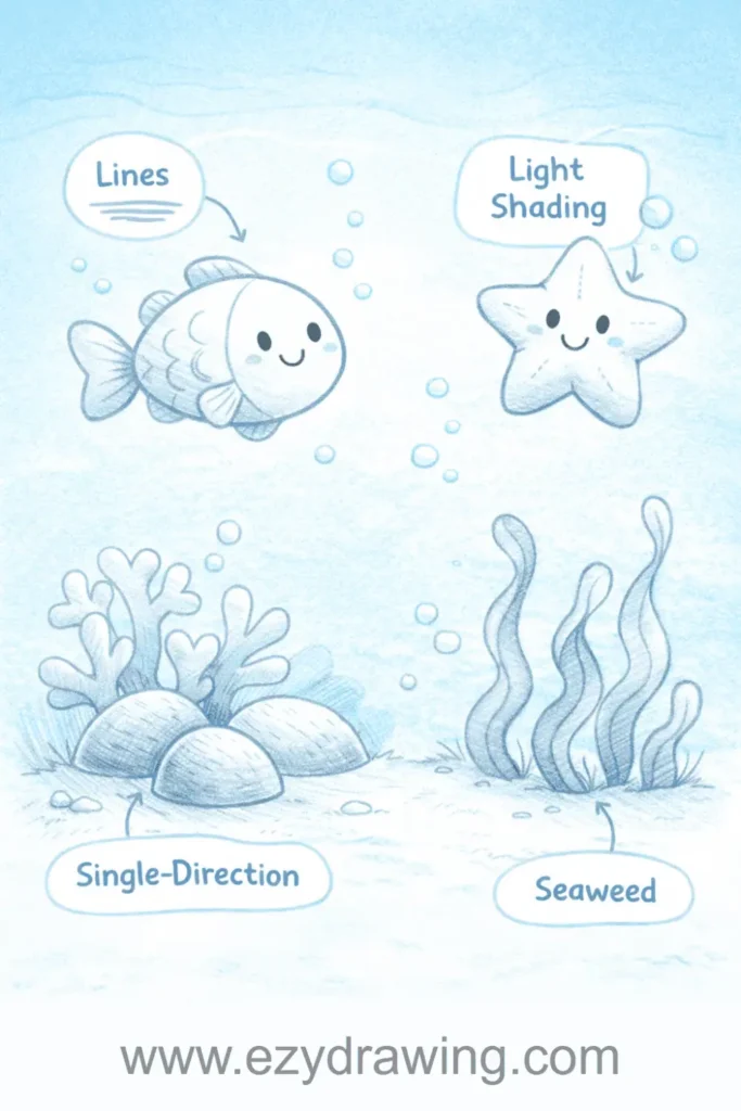 Pro Tip: Show kids how to use the side of their pencil for soft shading to create water depth, and the point for defining individual details like fish fins and coral textures.