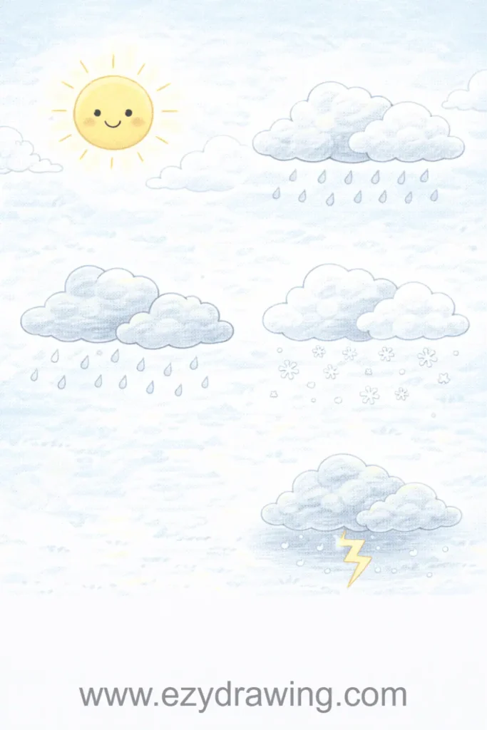 Shading gradients in clouds introduce subtle tonal transitions. Adding weather elements like raindrops, snowflakes, or lightning bolts incorporates pattern and rhythm into compositions.
