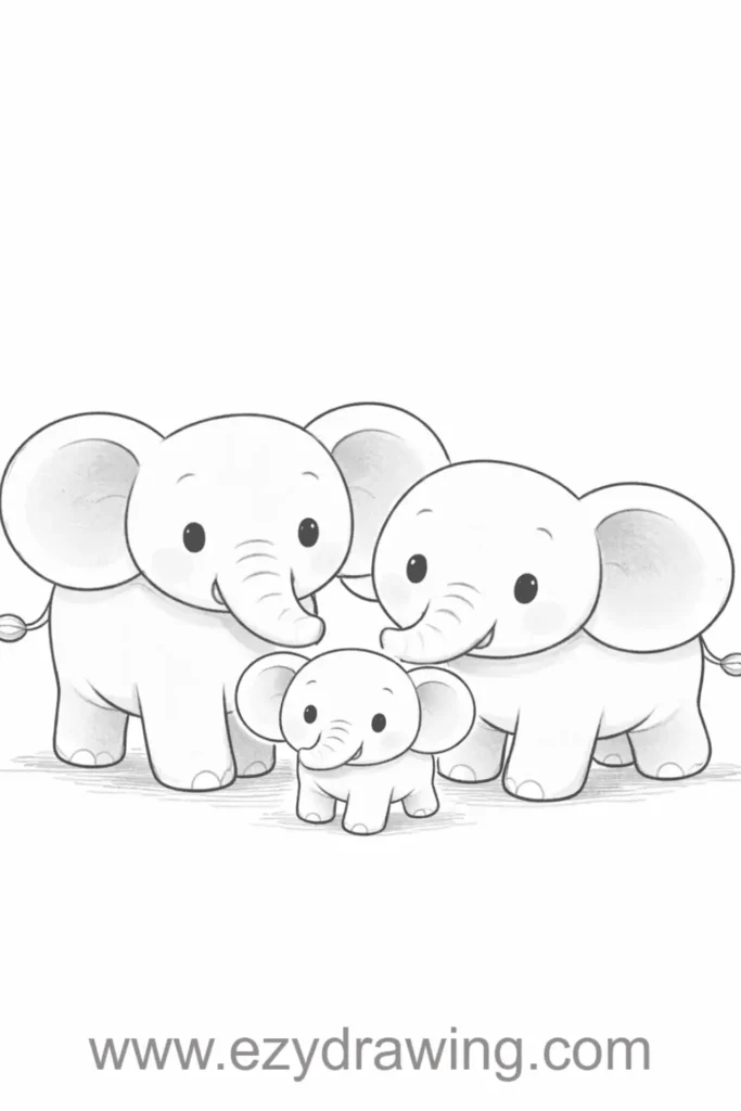 Drawing multiple elephants together challenges your elephant drawing skills with composition and perspective. Overlapping elephants create depth while showing social dynamics of these family-oriented animals.